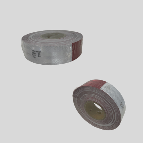 Esta cinta reflectiva viene en presentación de rollo, con medidas de 5 cm de ancho por 45.7 metros de largo, ideal para demarcar grandes superficies en vehículos de transporte. Su diseño alterna 28 cm en color rojo y 18 cm en color blanco, brindando un patrón visual de alta visibilidad conforme a la norma técnica colombiana NTC 5807, que regula los dispositivos de señalización y marcado vehicular.